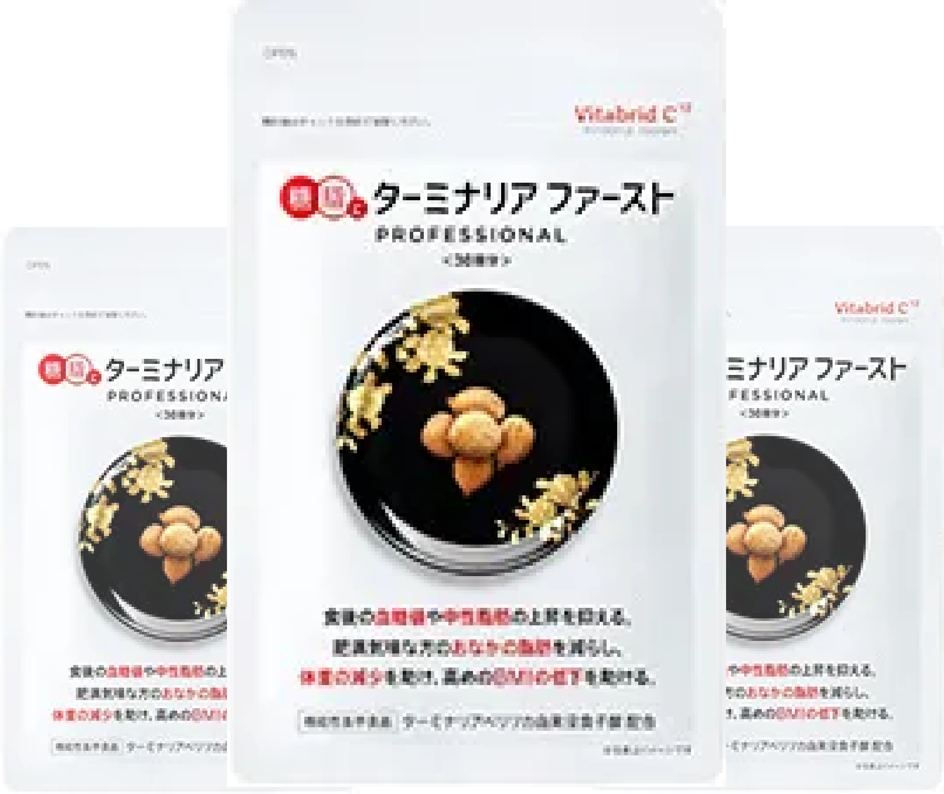 研究レビューで「食後の血糖値の上昇を有意に抑制」「食後の中性脂肪の上昇を有意に抑制」することがそれぞれ報告されているターミナリアベリリカ由来没食子酸を配合。